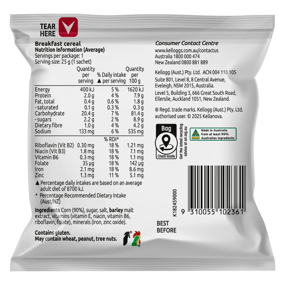 Kellogg’s® Corn Flakes cereal has been kickstarting breakfasts across Australia since 1924. With delicious, crispy, golden flakes of sun-ripened Aussie-grown corn, Kellogg's® Corn Flakes with fresh milk is a great start to the day. It’s also a great source of vitamins, zinc and iron with no artificial colours, flavours or preservatives.