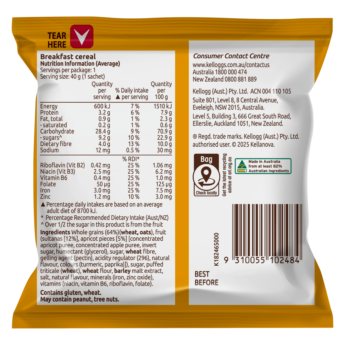 wheat, oats ), fruit (sultanas [12%], apricot pieces [5%] [concentrated apricot puree, concentrated apple puree, invert sugar, humectant (glycerol), sugar, wheat fibre, gelling agent (pectin), acidity regulator (296), natural flavour, colours (turmeric, paprika)]), sugar, puffed triticale (wheat ),wheat flour,barley malt extract, salt, natural flavour, minerals (iron, zinc oxide), vitamins (niacin, vitamin B6, riboflavin, folate).