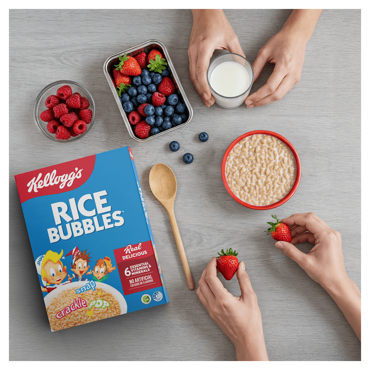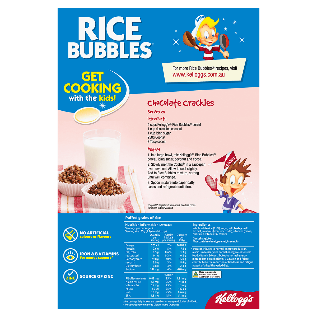 Kellogg's® Rice Bubbles® is a delicious breakfast cereal made out of puffed grains of whole white rice. It contains no preservatives, no artificial colours or flavours and provides 6 essential nutrients to give kids a fantastic kickstart to their days.