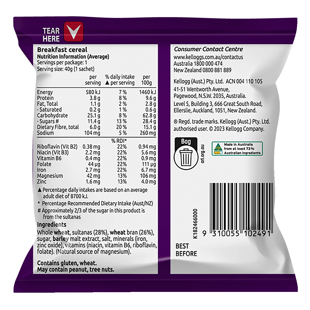 Kellogg's® Sultana Bran® is a delicious high fibre cereal with malty flakes of whole wheat and bran plus juicy sultanas. Health professionals recommend a daily fibre intake of around 25g for women and 30g for men^. With 20% of your daily fibre needs in a 40g serve, as well as the delicious taste of sultanas, Kellogg's® Sultana Bran® is a great way to start the day off right.