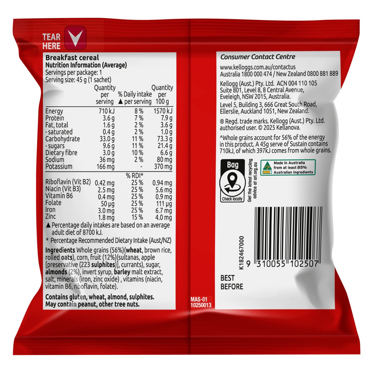 Kellogg's® Sustain® cereal is a combination of wheat, corn, brown rice, oats, sultanas, apple and almonds. This special medley of a cereal has been a favourite for years, given it’s tasty, low in sodium, a source of fibre and contains essential vitamins and minerals including iron. Great for breakfast or as a nutritious pre-training snack, Sustain® has plenty of Energy (630kJ per serve) to support a healthy varied diet and active lifestyle.